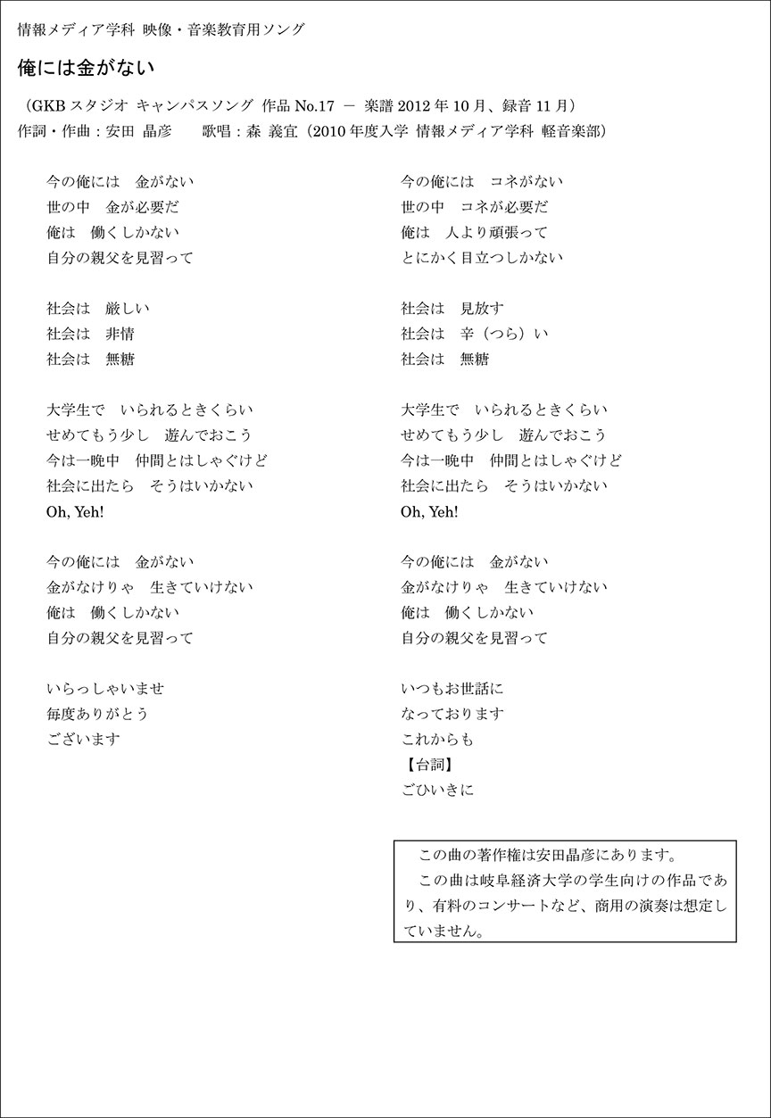 「俺には金がない」 (学生広報スタジオGKB キャンパスソング 作品No.17) 作詞・作曲:安田 晶彦 ©2013 Akihiko Yasuda 歌唱:森 義宜(2010年度入学 情報メディア学科 軽音楽部)
