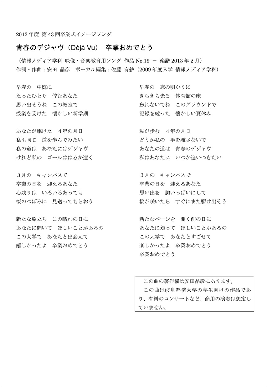 「青春のデジャヴ(Déjà Vu) 卒業おめでとう」 (学生広報スタジオGKB キャンパスソング 作品No.19) 作詞・作曲:安田 晶彦 ©2013 Akihiko Yasuda ボーカル編集:佐藤 有紗(2009年度入学 情報メディア学科)
