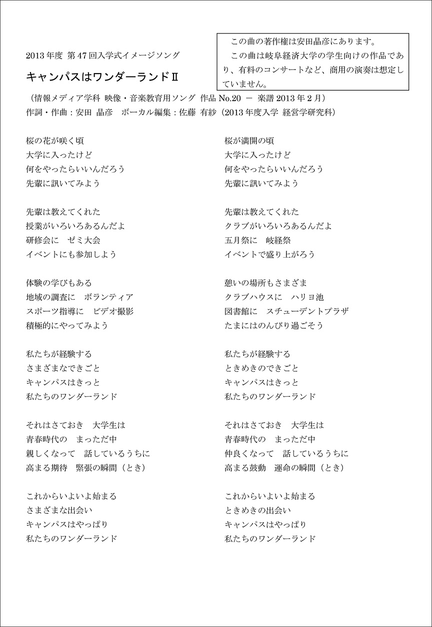 「キャンパスはワンダーランドII」 (学生広報スタジオGKB キャンパスソング 作品No.20) 作詞・作曲:安田 晶彦 ©2013 Akihiko Yasuda ボーカル編集:佐藤 有紗(2013年度入学 経営学研究科)